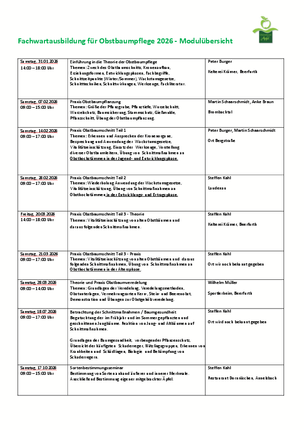 Module: Theorie der Obstbaumpflege, Pflanzung, Schnittmaßnahmen in Theorie und Praxis an unterschiedlichen Altersstufen, Baumgesundheit, Obstbaumveredelung, Sortenbestimmung